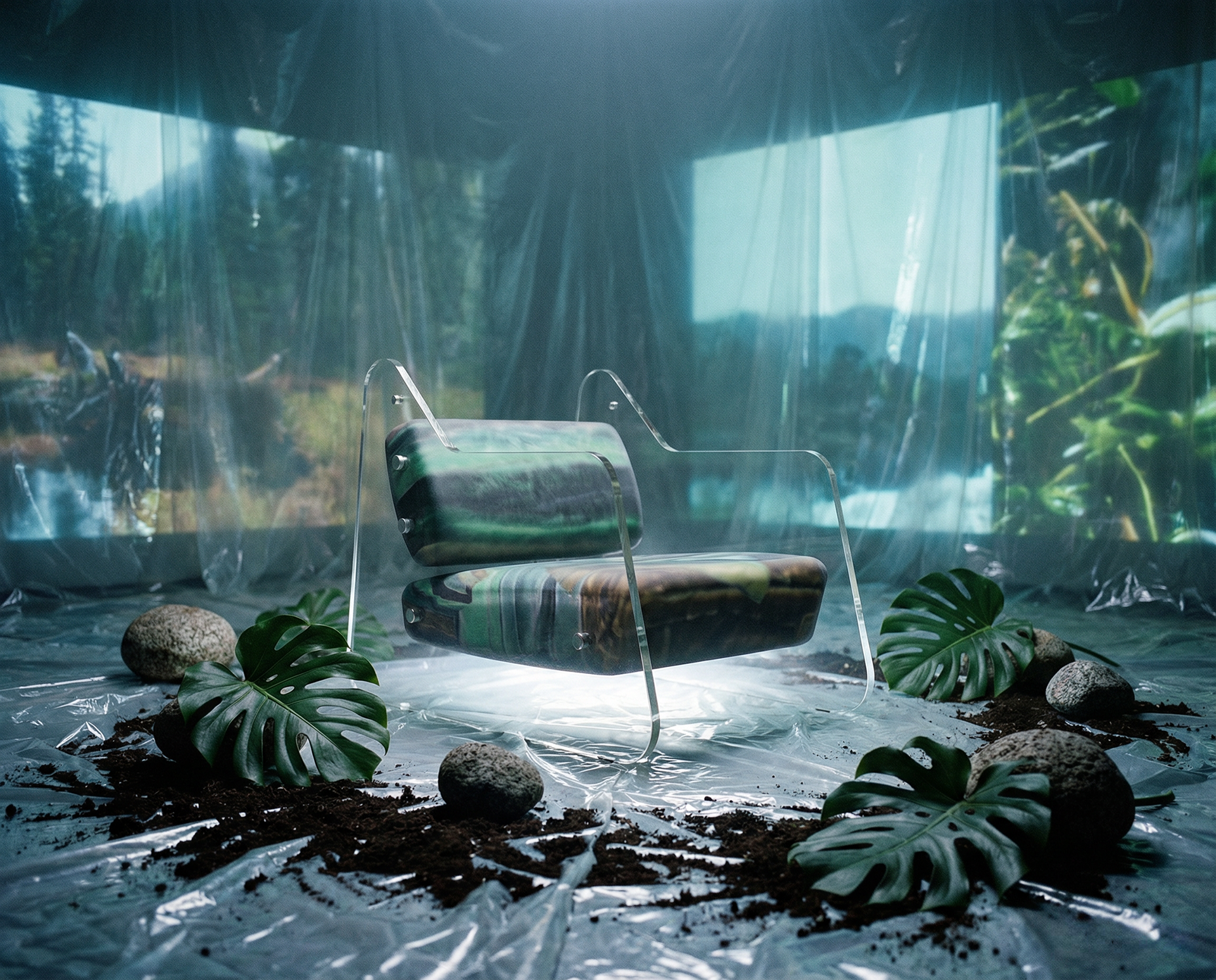 Seat Surface: A transparent cover made from recycled material makes the upcycling visible, each chair is one of a kind, showcasing the individual garments inside